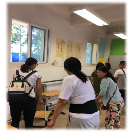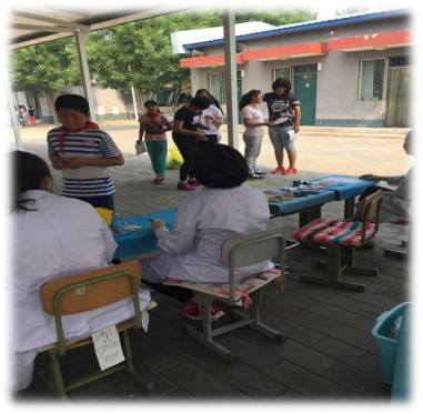 遇到学校硬件条件有限时,院内的树荫边,凉棚下便成了他们工作的场所,他们依然是那样的精神集中、一丝不苟。真可谓:“足蒸暑土气,背灼炎天光”!