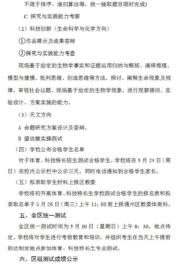2021年中国人民大学附属中学通州校区初升高体育、科技特长招生简章