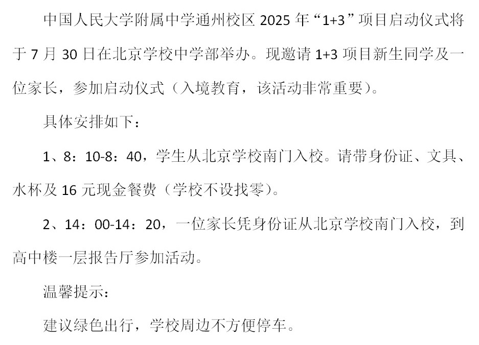中国人民大学附属中学通州校区2025年“1+3”项目启动仪式公告