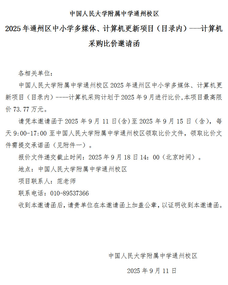 中国人民大学附属中学通州校区2025年通州区中小学多媒体、计算机更新项目(目录内)---计算机采购比价邀请函
