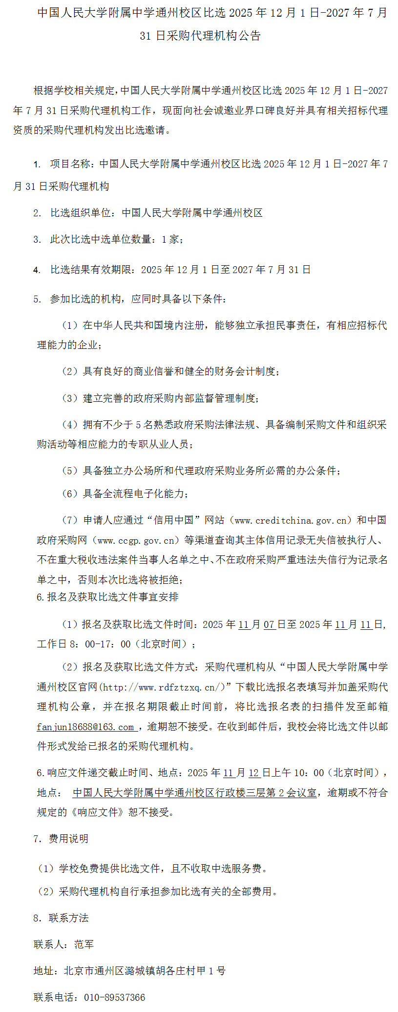中国人民大学附属中学通州校区比选2025年12月1日-2027年7月31日采购代理机构公告