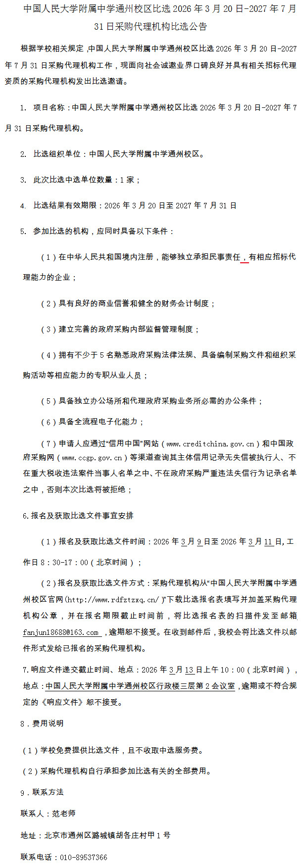 中国人民大学附属中学通州校区比选2026年3月20日-2027年7月31日采购代理机构比选公告