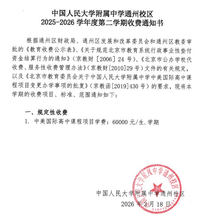 中国人民大学附属中学通州校区2025-2026学年度第二学期收费通知书